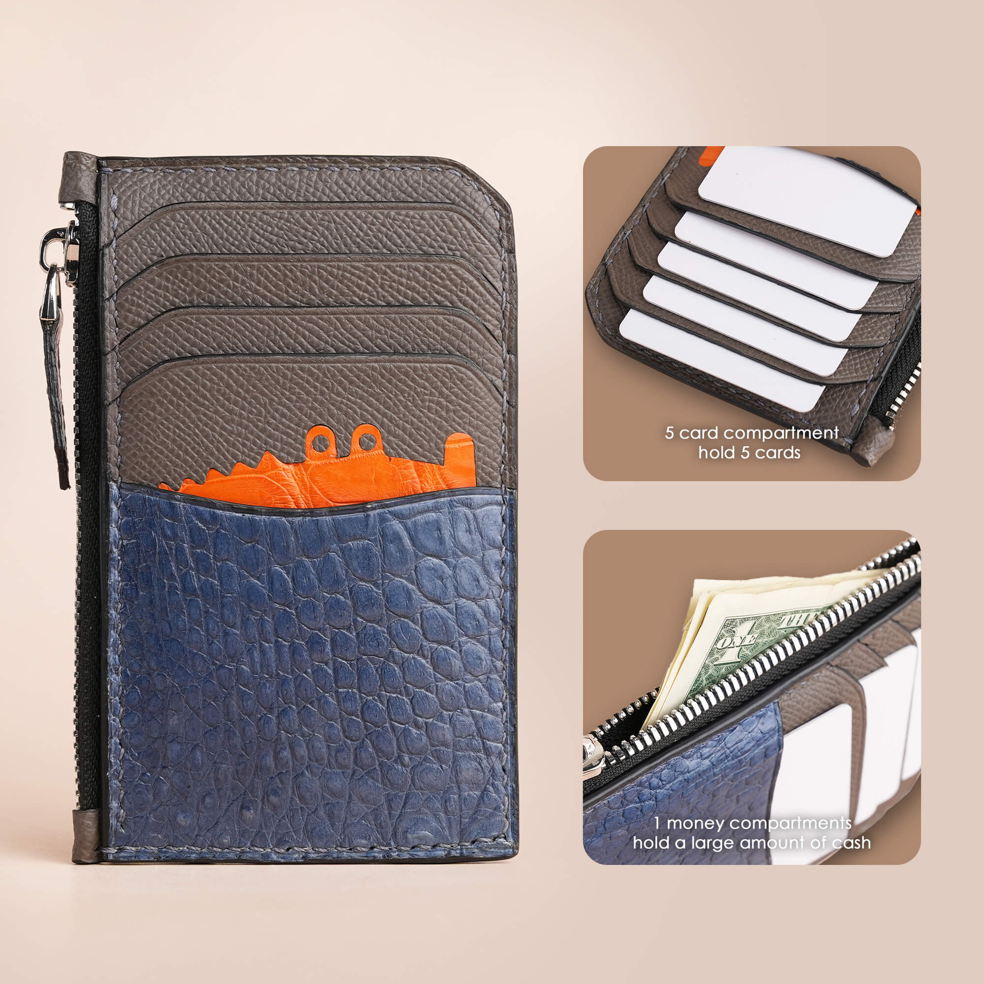 Elevate your everyday carry with this standout piece, the wallet crafted from premium Alligator and Epsom leather, this zippered credit card wallet offers a perfect blend of luxury and functionality, it's featuring a bold and playful Alligator Stupid design, it includes 5 card slots and a spacious money compartment to hold cash securely. The high-quality leather ensures durability and an elegant texture, making it an ideal choice for those who appreciate fine craftsmanship and unique designs.