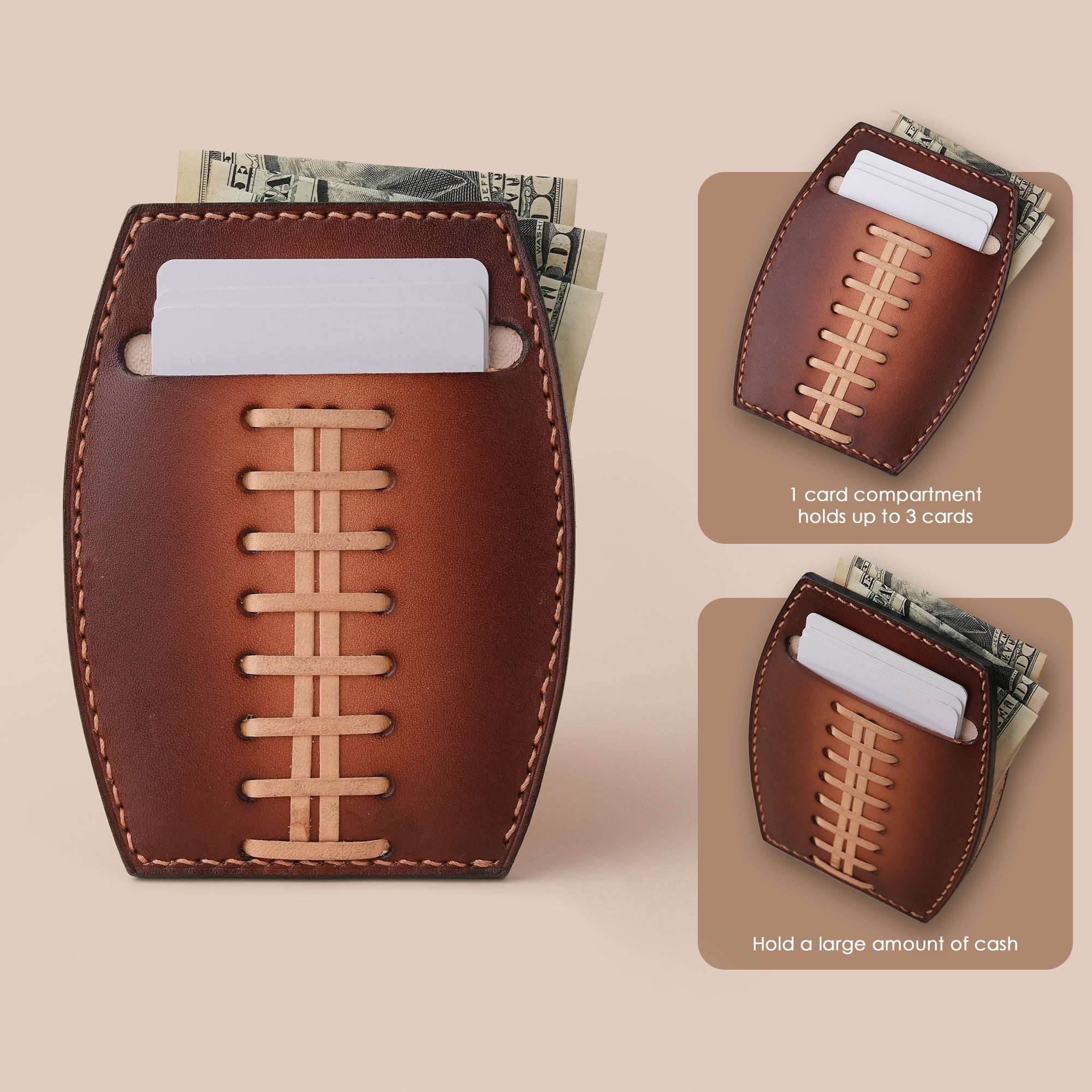 Crafted from premium Vegetable Tanned Leather. This wallet features two compartments, allowing you to securely store about 4 cards and some cash. The design is inspired by the iconic American football, making it a unique and stylish accessory. Perfect for sports enthusiasts who appreciate both functionality and a distinctive aesthetic