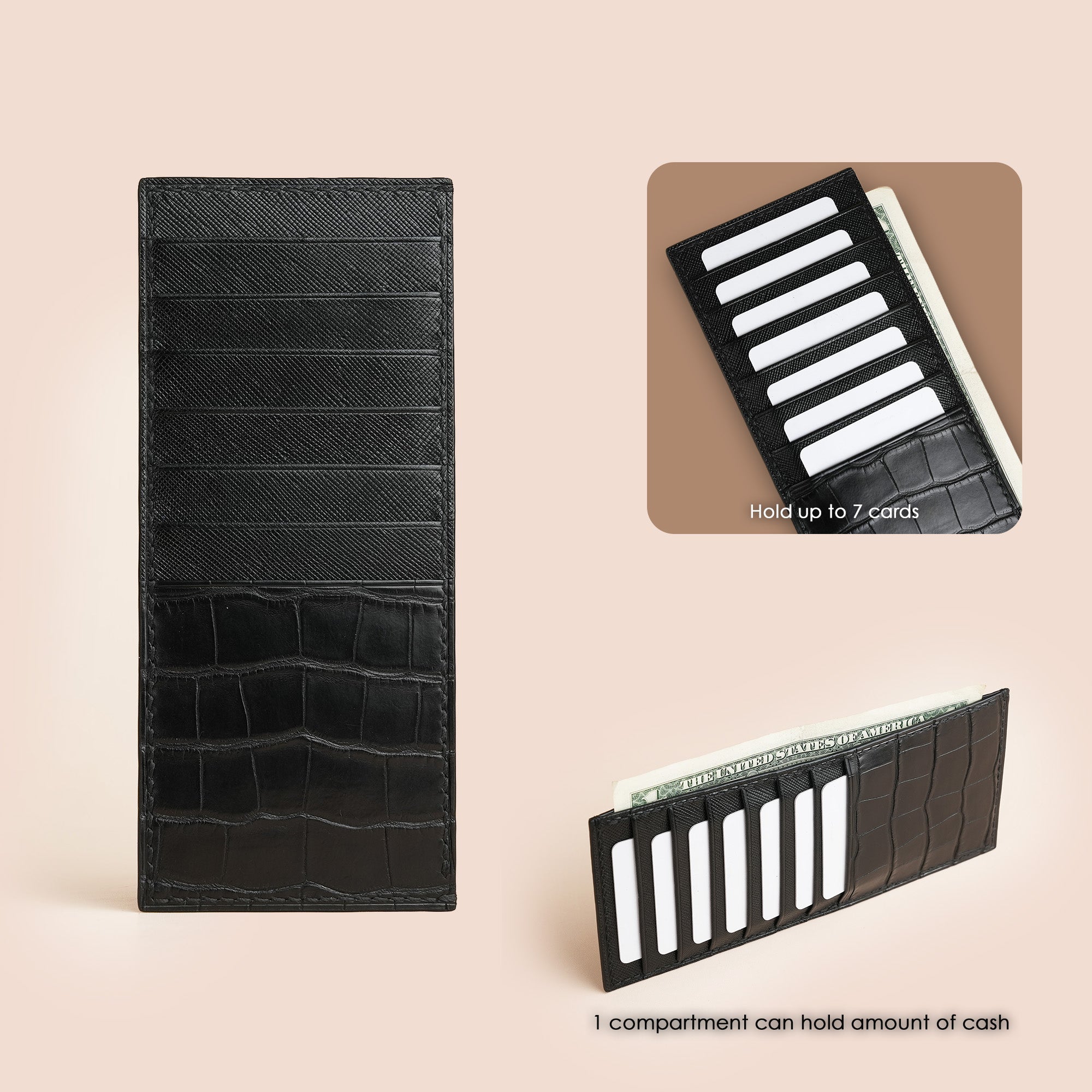 Crafted from premium black alligator leather with Saffiano leather lining, this vertical card holder combines luxury and function. Its sleek profile fits easily in suit pockets while showcasing bold texture and timeless elegance.