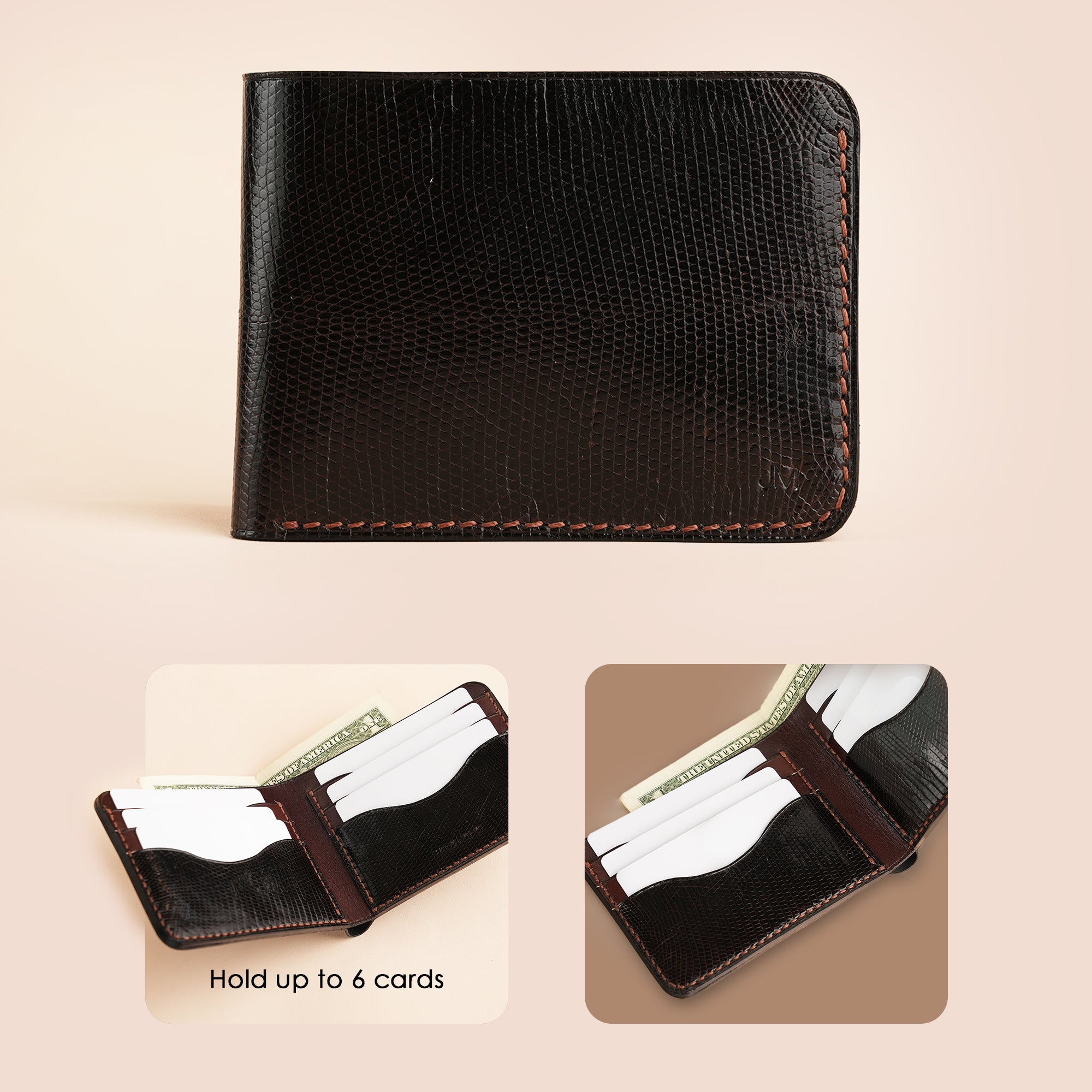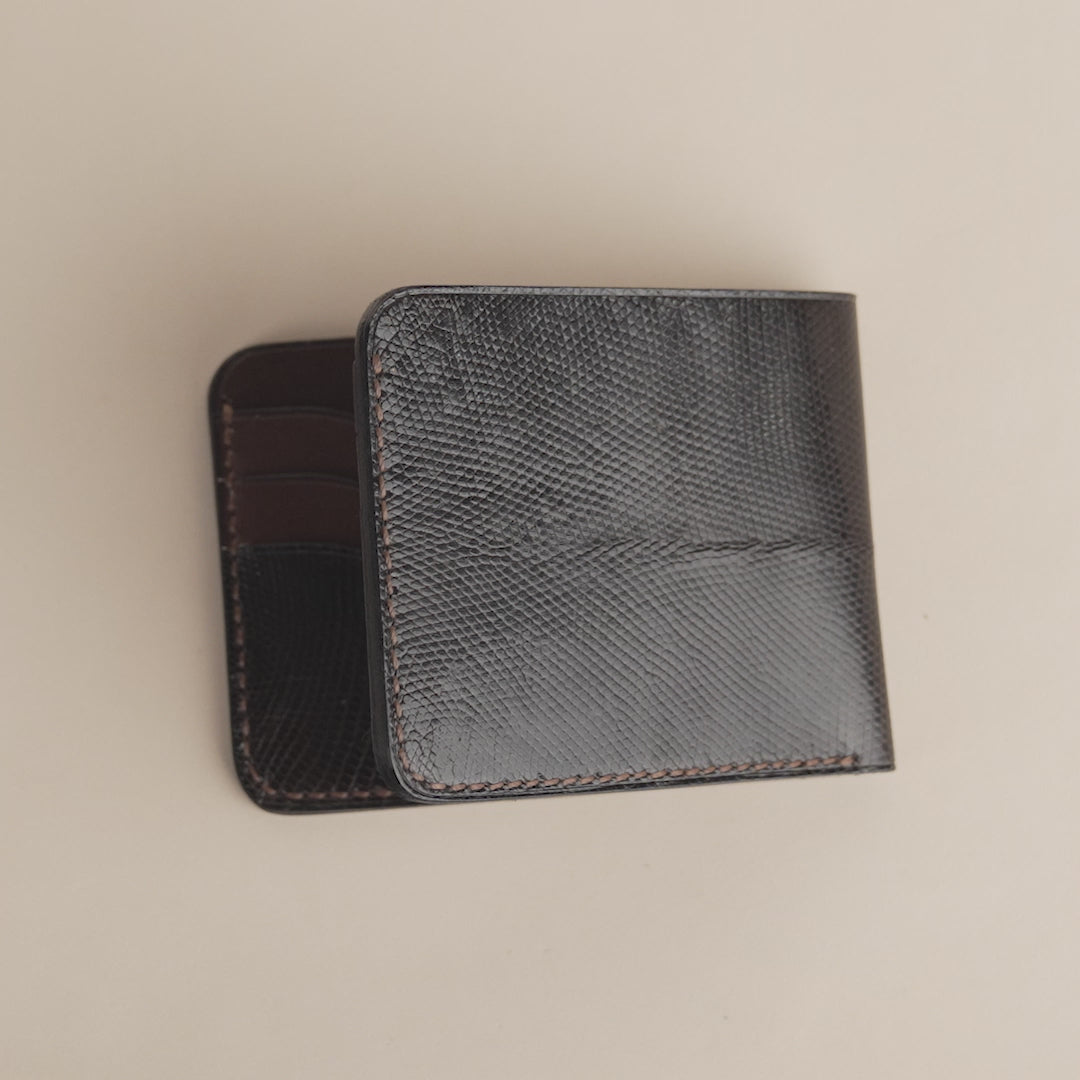 Crafted from a refined combination of premium Lizard leather and rich vegetable tanned leather, this bifold wallet blends elegance with durability. Featuring a distinctive wave cut pocket design, it offers six card slots and a central bill compartment, perfect for those who appreciate slim sophistication without compromising on utility. The natural grain of lizard skin adds a textured depth that makes each wallet truly unique.
