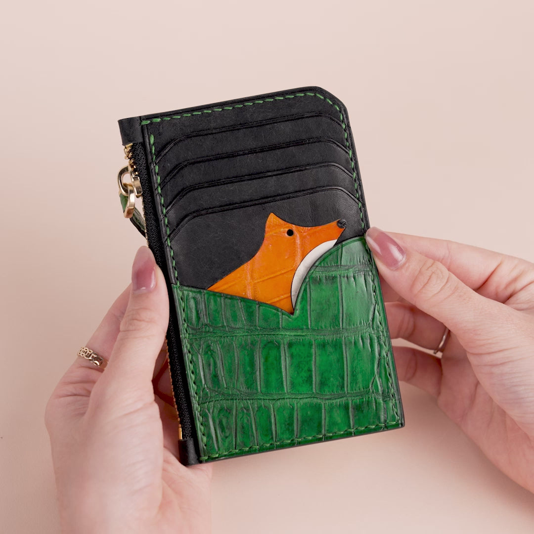 Crafted with premium Pueblo leather, this elegant zippered wallet features a playful fox accent made from luxurious alligator leather. Designed for convenience, it includes 4 card slots accommodating up to 5 cards and a spacious money compartment for cash or essentials. A stylish yet functional statement piece for refined everyday carry.