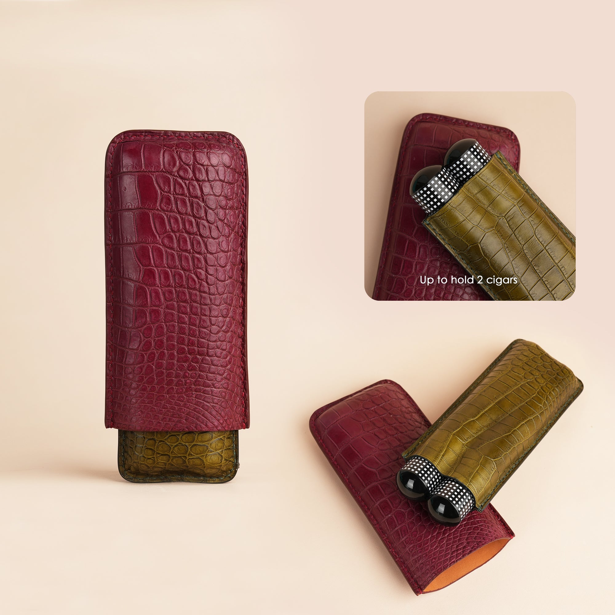 Burgundy mix Olive Alligator Leather Cigarettes Case Holder is crafted from luxurious alligator leather in a vibrant burgundy mix olive. Designed to hold up to 2 cigars, this elegant case offers both protection and sophistication for your essentials. A bold accessory for those who appreciate fine craftsmanship and standout style.