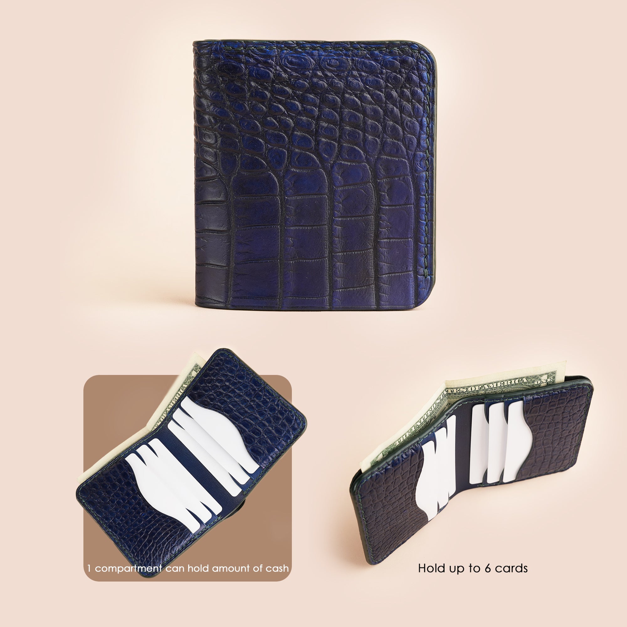 Crafted from premium crocodile and vegetable tanned leather, this bifold wallet blends classic elegance with bold color. It offers space for up to 6 cards and features a full size compartment to securely hold your cash. A luxurious essential made for those who appreciate refined craftsmanship.