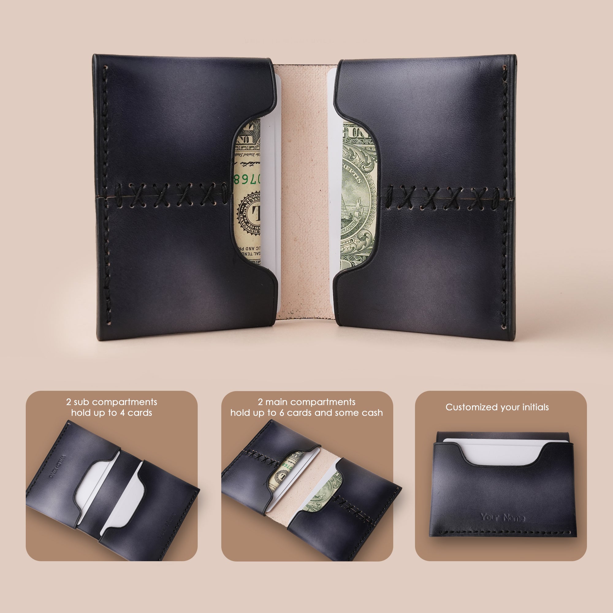 All wallets are sewn by hand, the thread is sewn in a cross stitch style on both sides around the edge of the wallet, making it sturdy and bringing high aesthetics to the card holder.