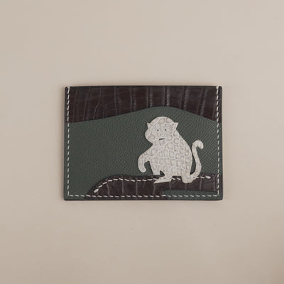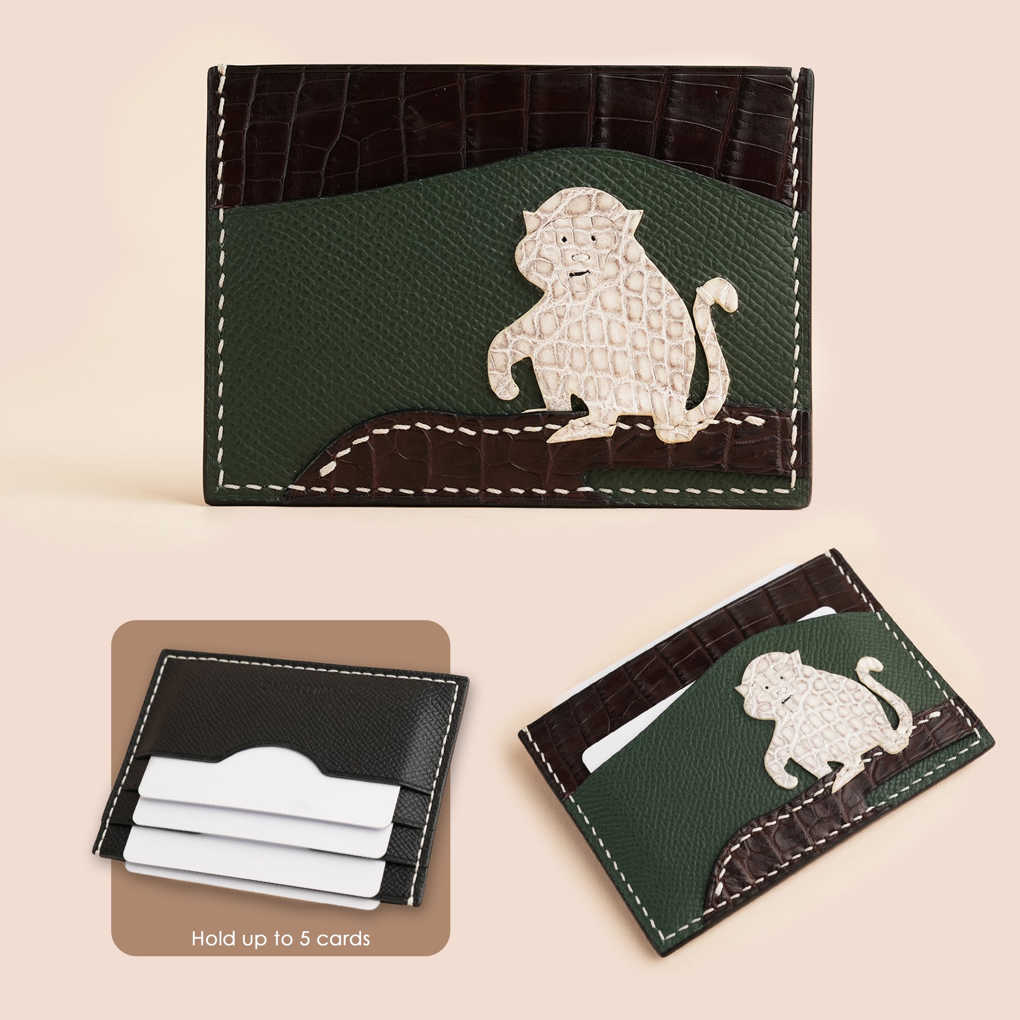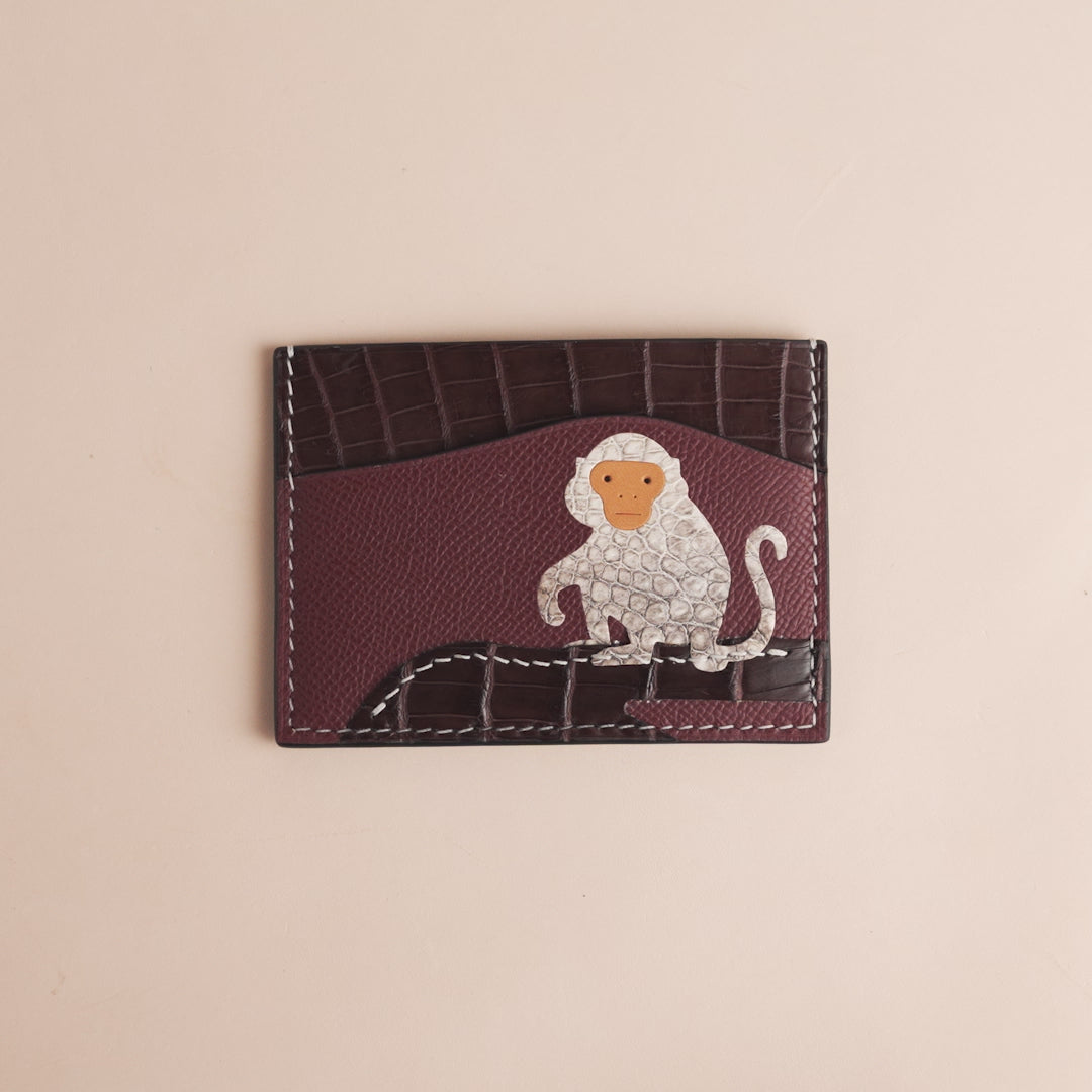 Meet the playful sophistication of the Stupid Monkey card holder, a conversation-starting accessory handcrafted from premium Epsom, Alligator, and Himalayan leather. The front features an expressive monkey motif carefully inlaid from exotic hides, symbolizing curiosity and charm.