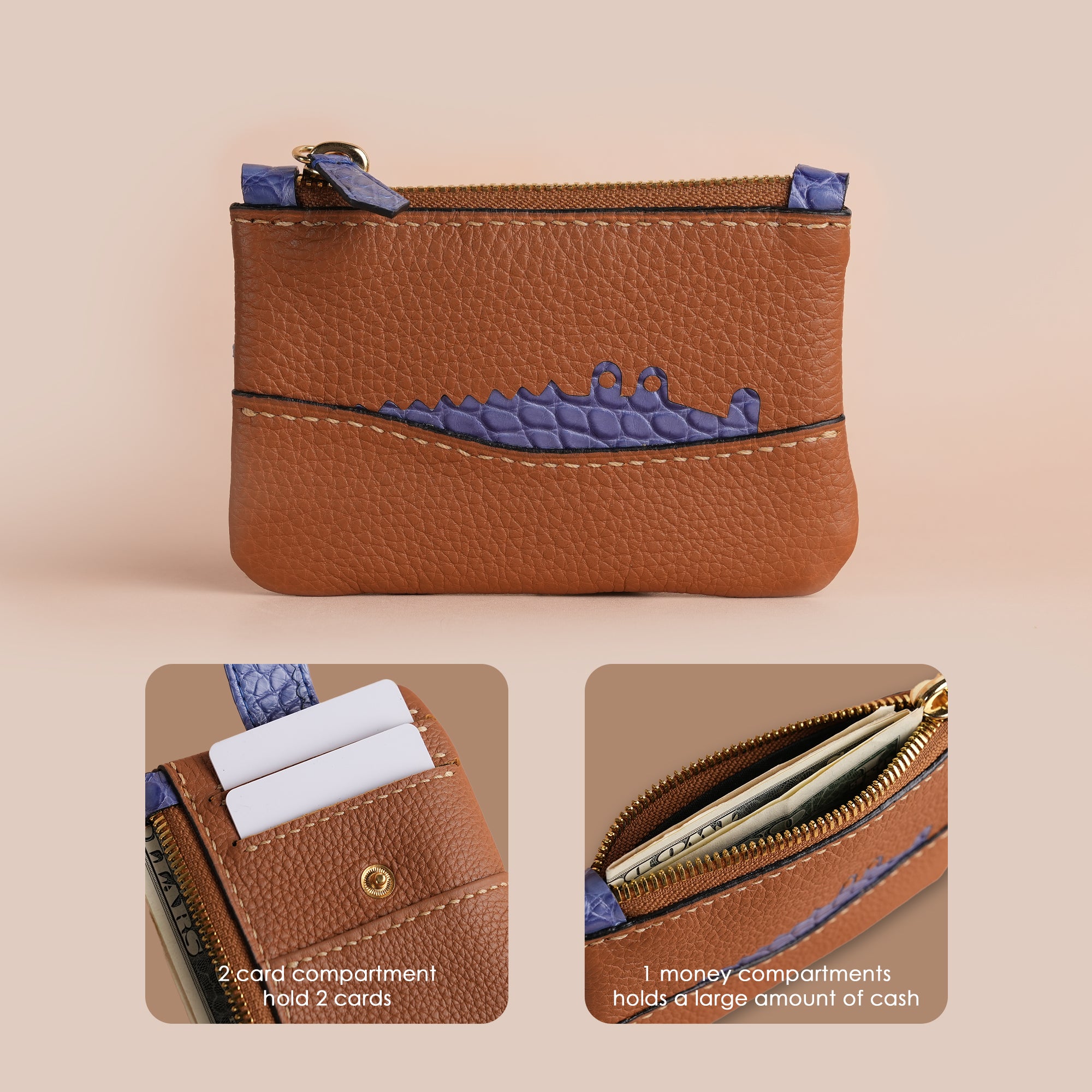 With a playful twist. Crafted from premium golden Togo leather and accented with light blue alligator detailing, it features two card compartments for easy organization and a secure zippered section for cash and coins. Highlighted by a whimsical "stupid alligator" motif, this compact yet spacious wallet is perfect for adding personality to your everyday essentials. Handcrafted with precision, it offers durability, style, and a unique design for modern elegance.