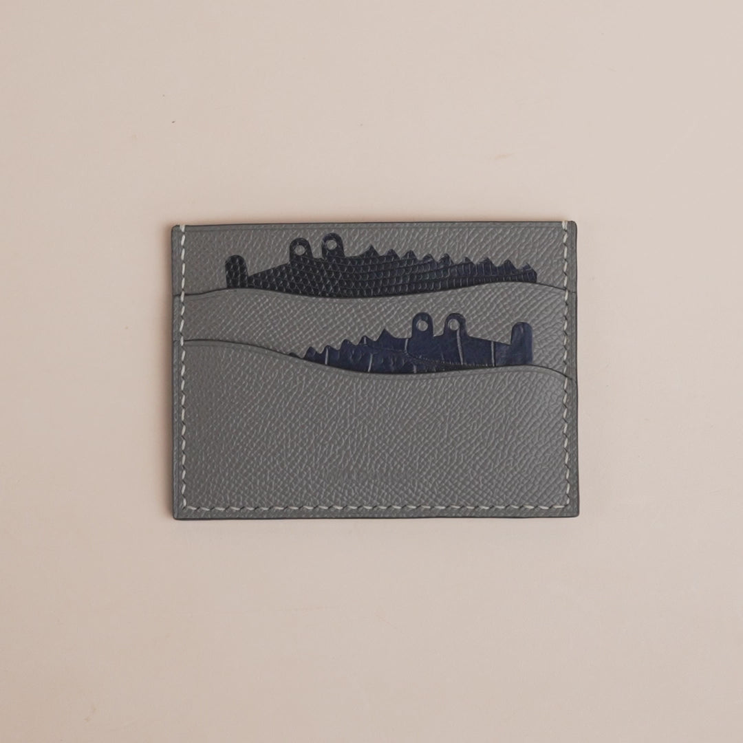 Streamline your essentials with this exceptionally crafted slim card holder. Built upon resilient graphite grey Epsom leather, it delivers a sleek, modern feel. One side showcases an exotic panel of luxurious black crocodile skin, while the reverse features two playful black alligator cutouts peeking through. Housing 6 cards across both faces, it flawlessly merges executive sophistication with a touch of quirky charm.