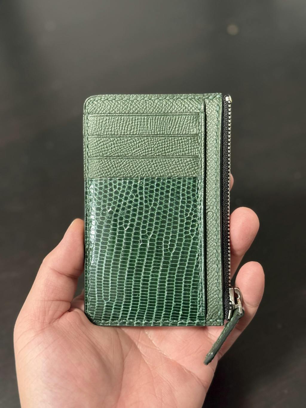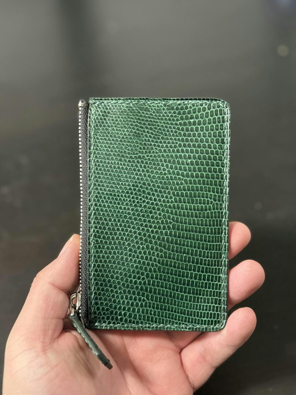 This slim yet functional card holder features two card compartments and one money compartment, perfectly sized to hold 5-6 cards along with cash. The cardholder is made from luxurious Pueblo leather, while the fox design is meticulously created from vibrant alligator leather, adding a unique and stylish touch. Ideal for those seeking a sleek and distinctive way to carry essentials