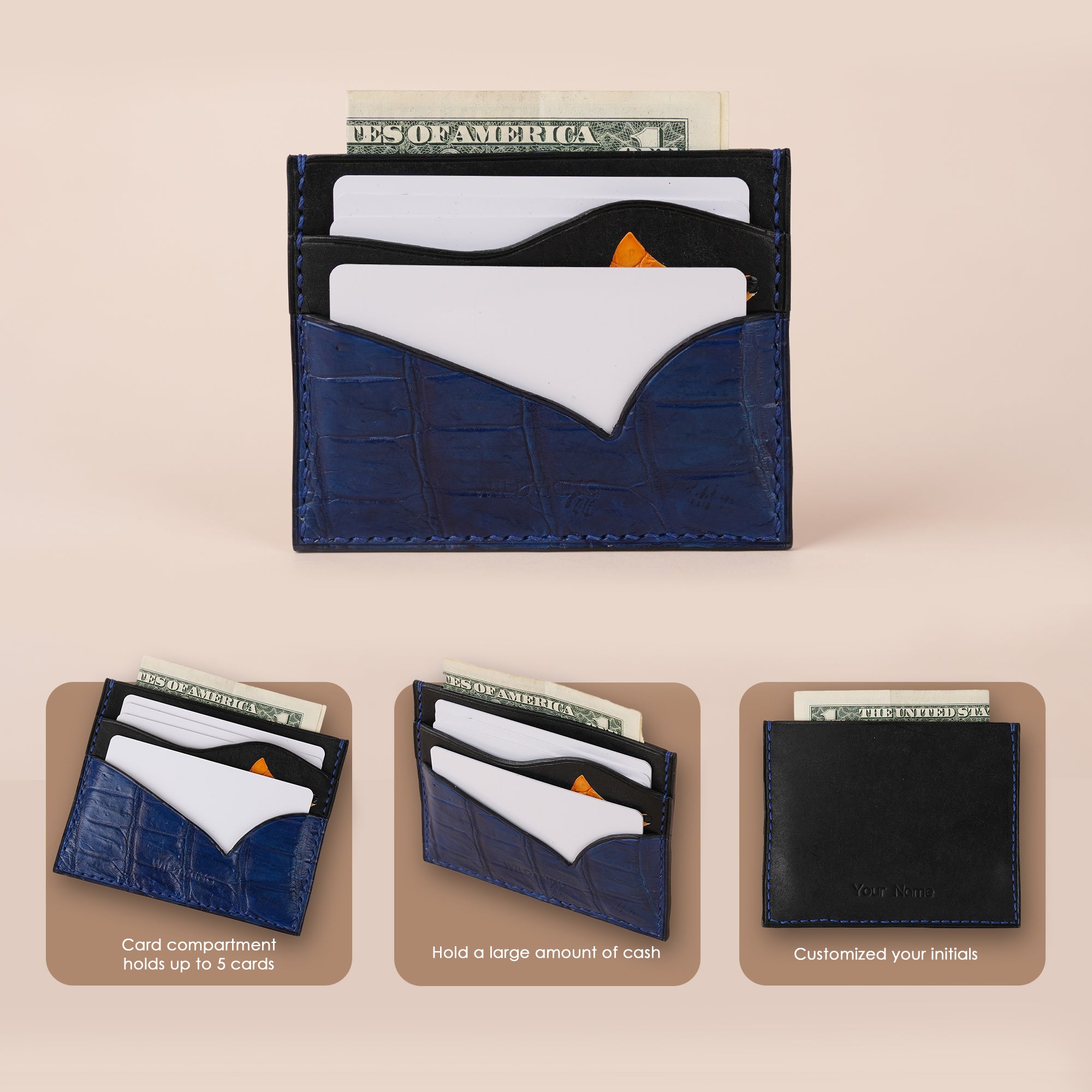This slim yet functional card holder features two card compartments and one money compartment, perfectly sized to hold 5-6 cards along with cash. The cardholder is made from luxurious Pueblo leather, while the fox design is meticulously created from vibrant alligator leather, adding a unique and stylish touch. Ideal for those seeking a sleek and distinctive way to carry essentials