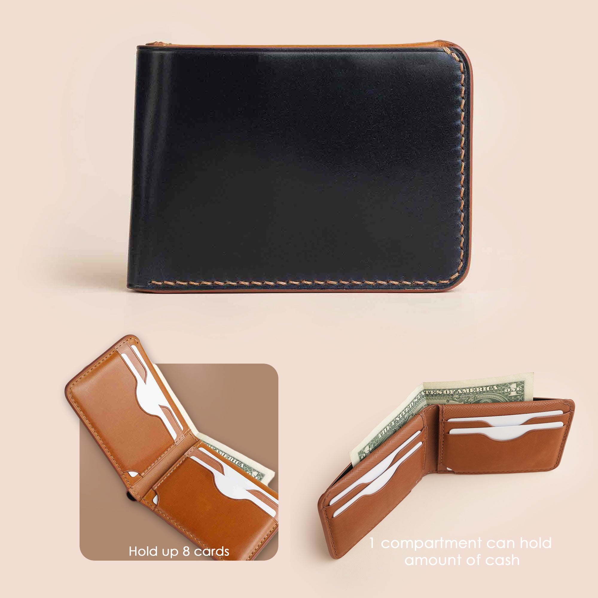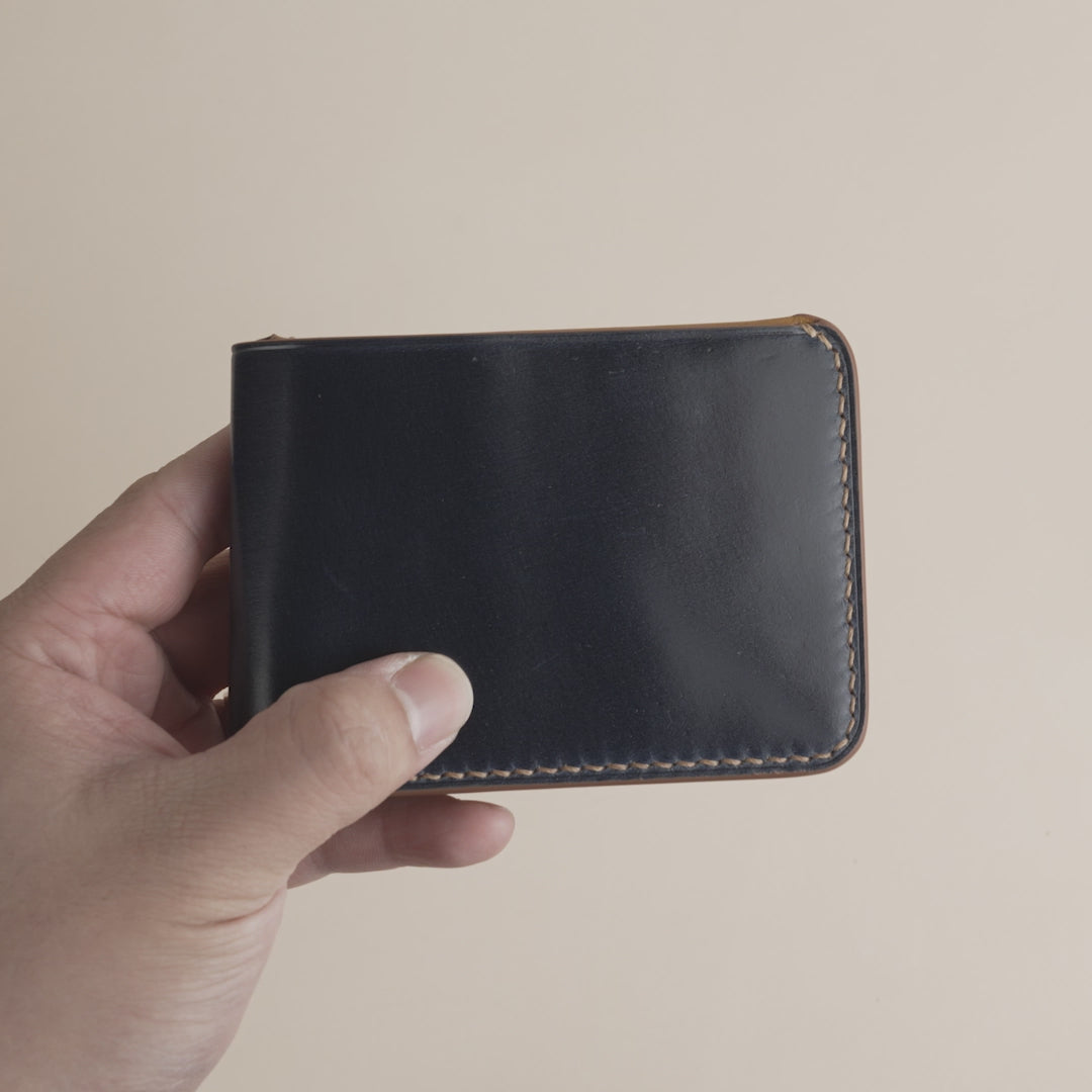 Handcrafted from the finest Shell Cordovan leather, this Wing Bifold Wallet is the ultimate blend of refined luxury and everyday functionality. With its rich navy exterior and smooth tan interior, it’s more than a wallet, it’s a statement.