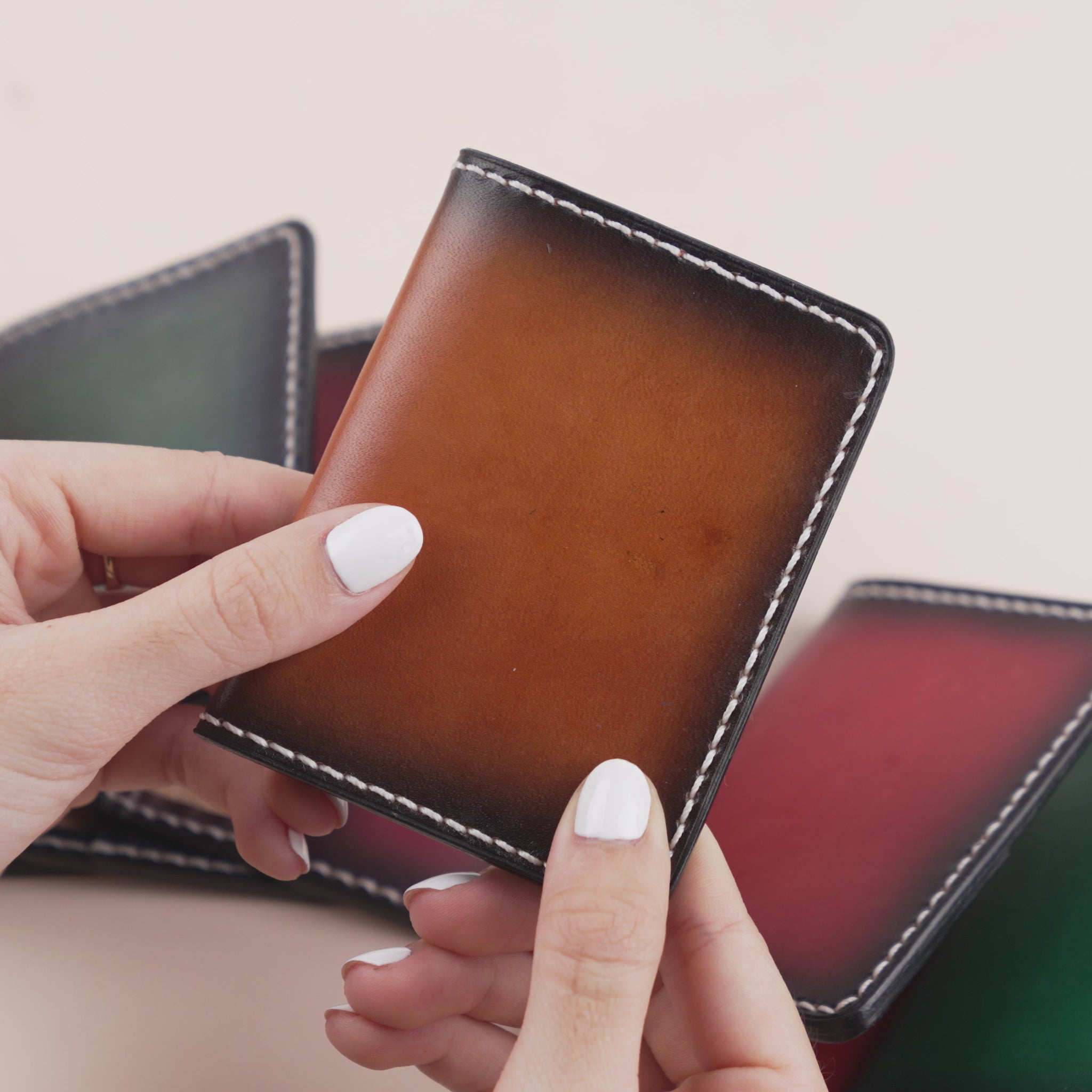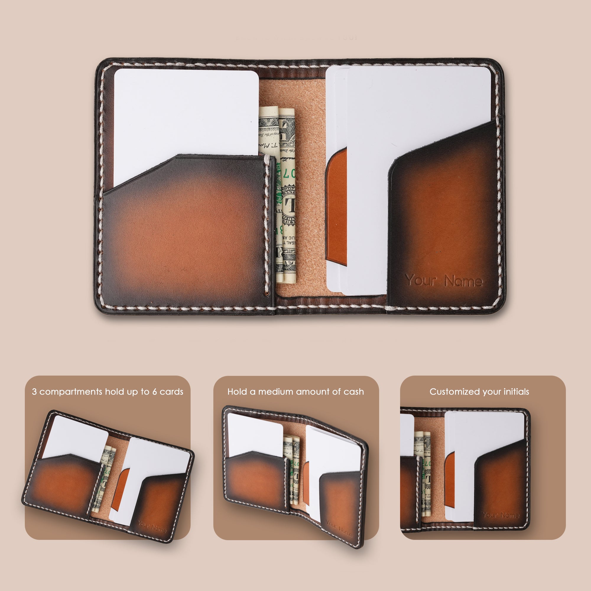 Crafted from premium vegetable-tanned leather and Designed with four slots, perfect for holding up to 6 cards and some cash finished with a sophisticated patina, Its vertical bifold design ensures it fits easily into your pocket while providing ample storage for your essentials this wallet offers both style and functionality the perfect blend of timeless elegance and practicality