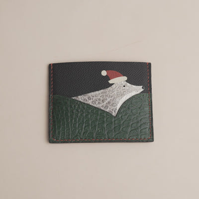 Design Handmade using a combination of Epsom leather, rich green alligator leather, and rare Himalayan leather, this card holder features an adorable fox wearing a Santa hat, artfully inlaid across the front. With its red accent stitching and contrasting textures, this piece brings warmth, charm, and craftsmanship together in perfect harmony.