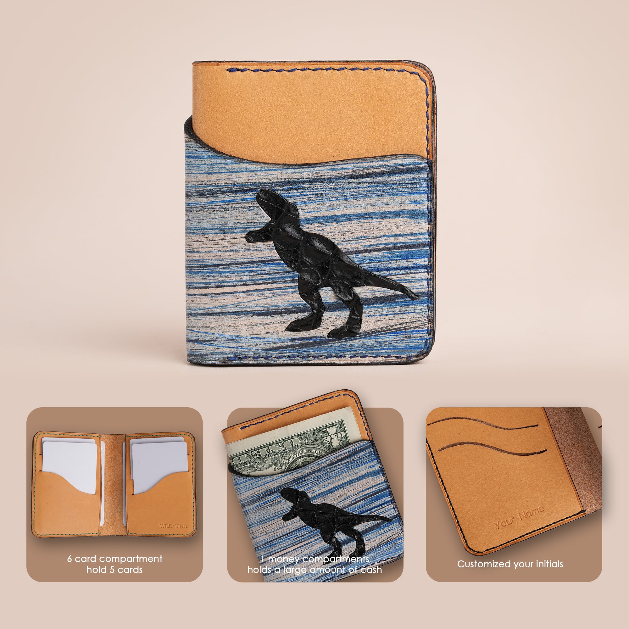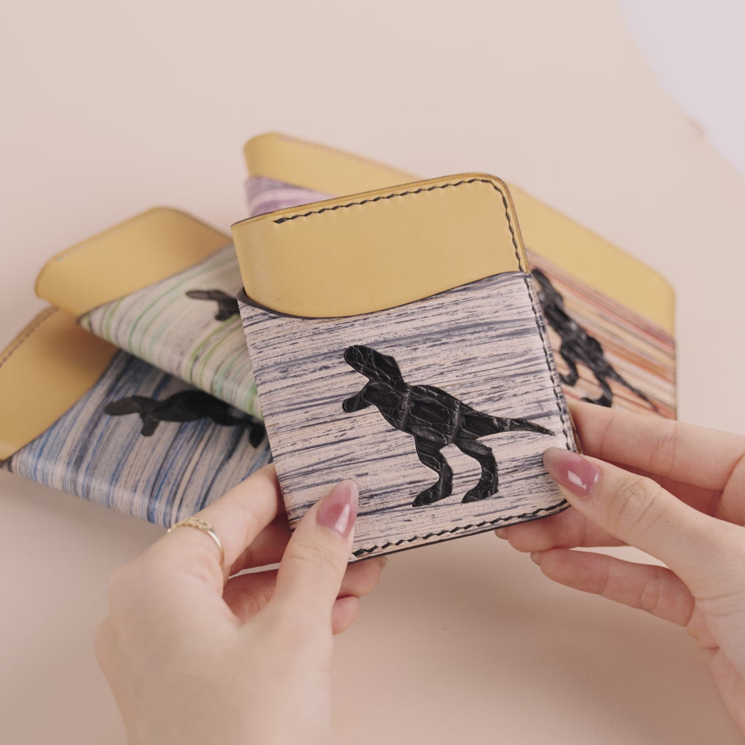 Crafted from premium vegetable tanned leather, this unique wallet showcases a vibrant Natural Streaks pattern and a standout alligator leather dinosaur accent. It features 6 card compartments accommodating up to 6 cards and a spacious money compartment for holding a large amount of cash. A perfect blend of artistry and functionality, this wallet is a statement of craftsmanship and individuality.