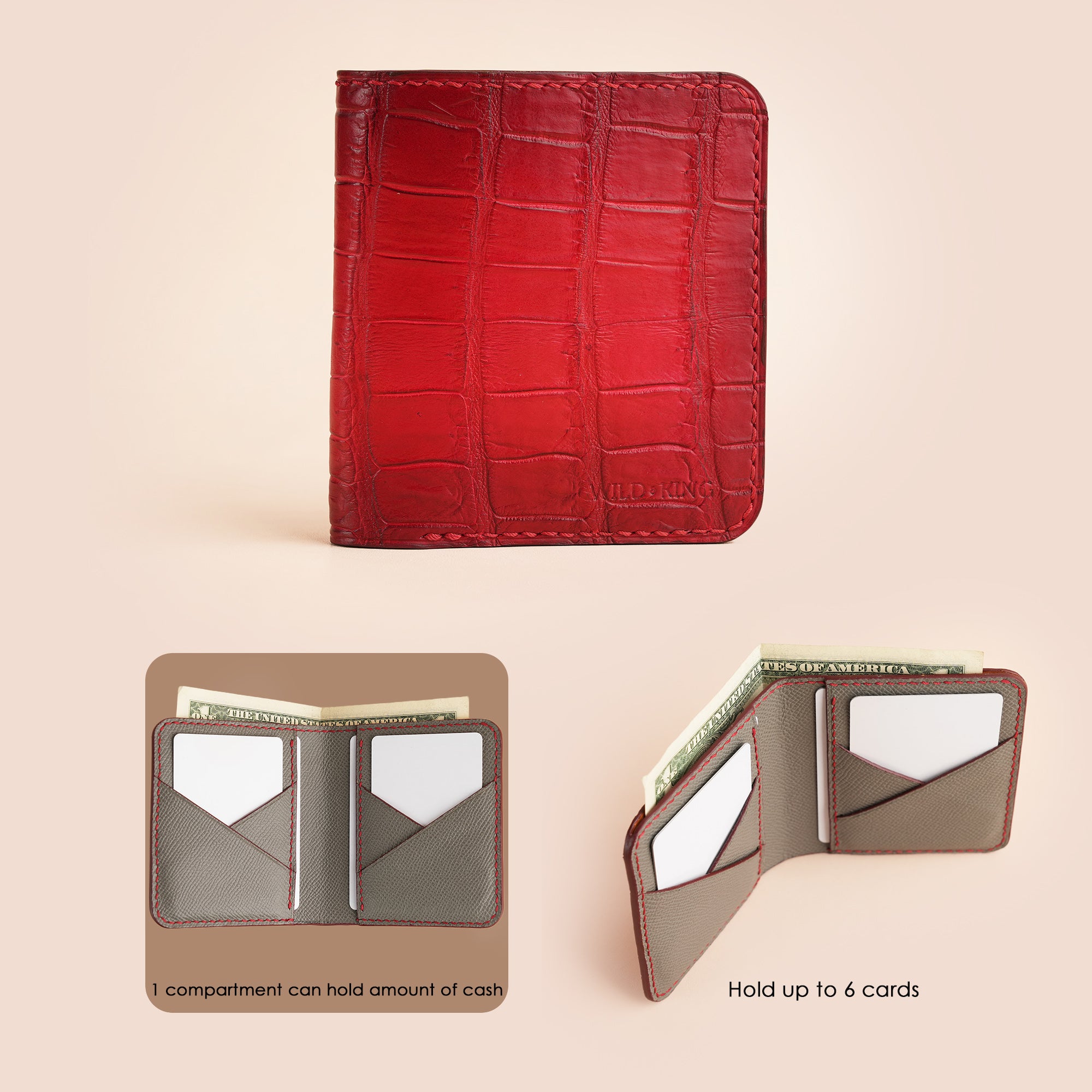 Square Shape Red Crocodile Leather Bifold Wallet - Patina Finish