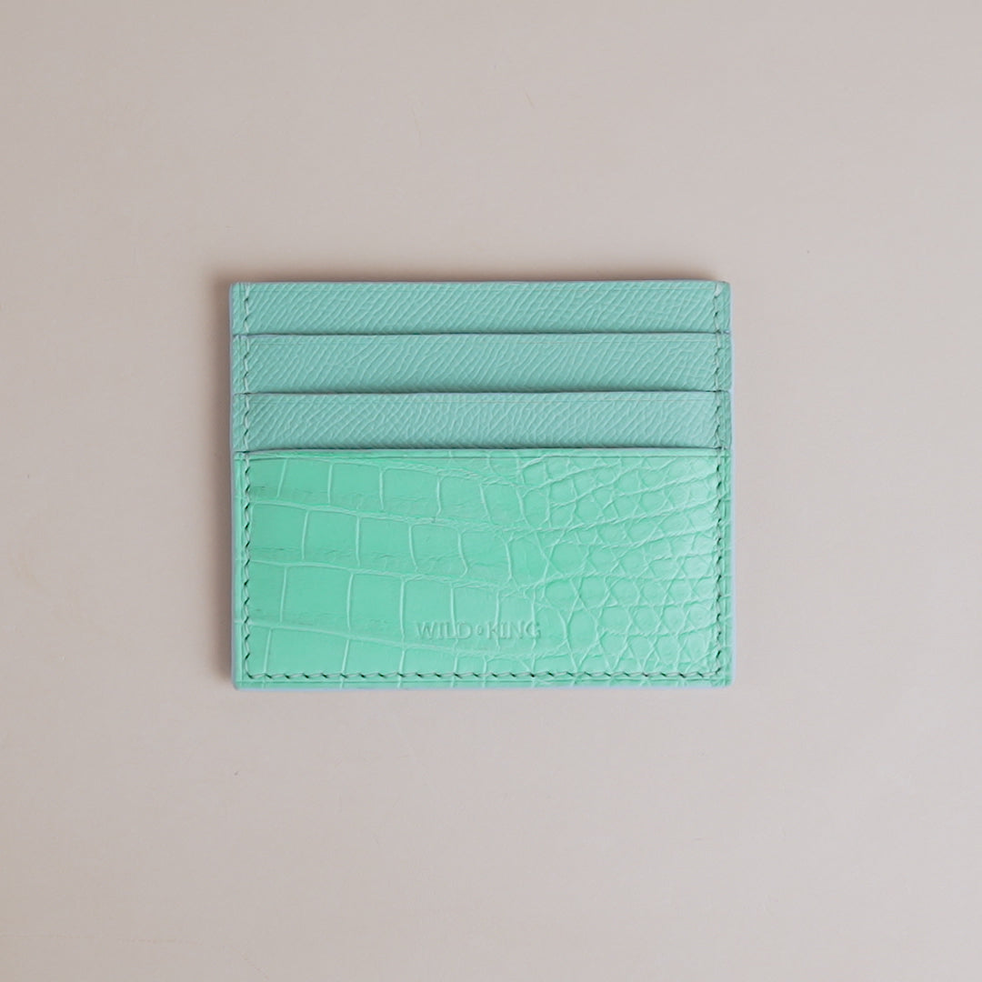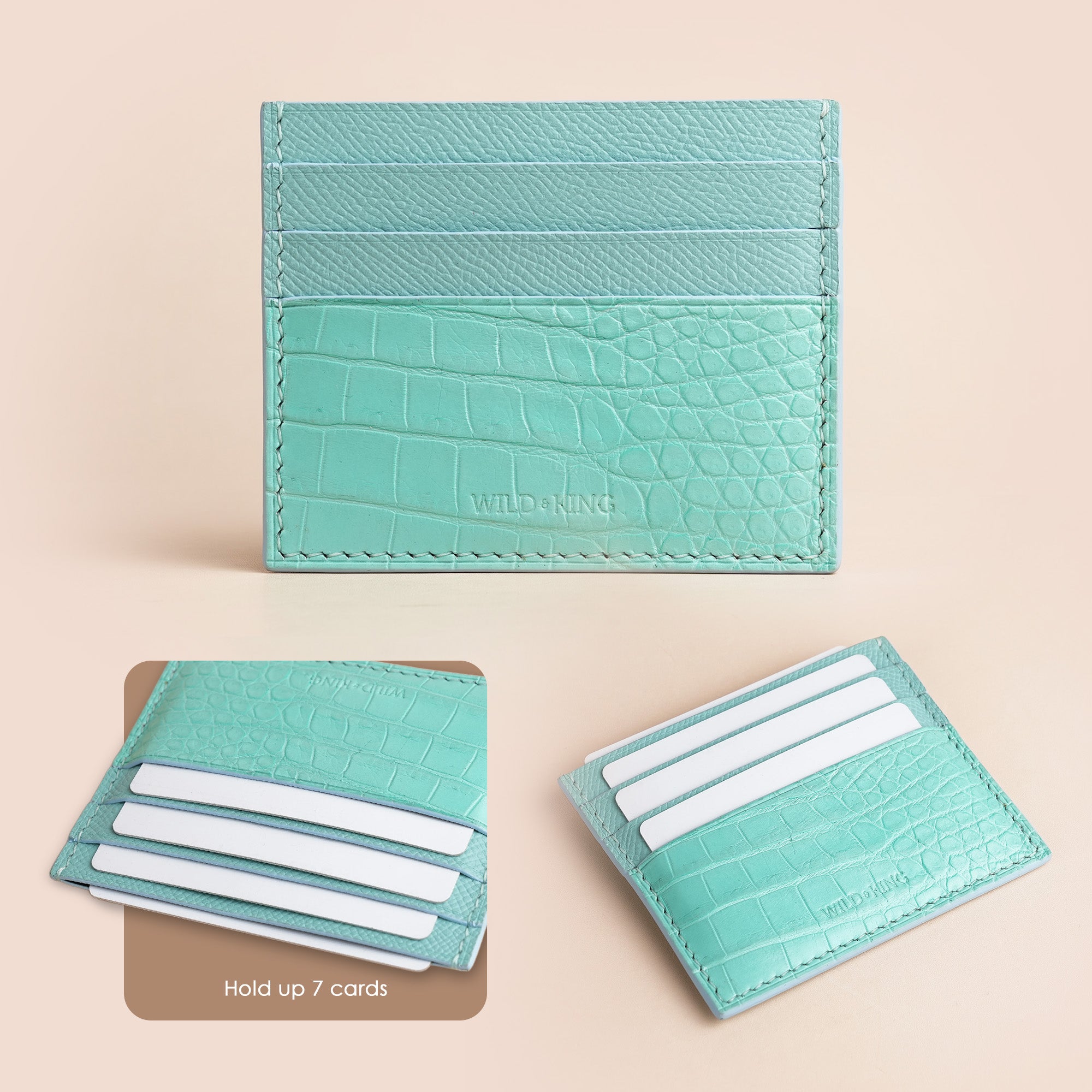 Break away from the ordinary with a splash of vibrant exotic luxury. This card holder showcases genuine Turquoise Alligator leather, treated with a hand-finished patina that highlights every scale’s intricate detail. Sleek, compact, and undeniably bold, it organizes up to 7 cards while acting as a stunning conversation piece every time you pay. Ideal for those who view their accessories as art.